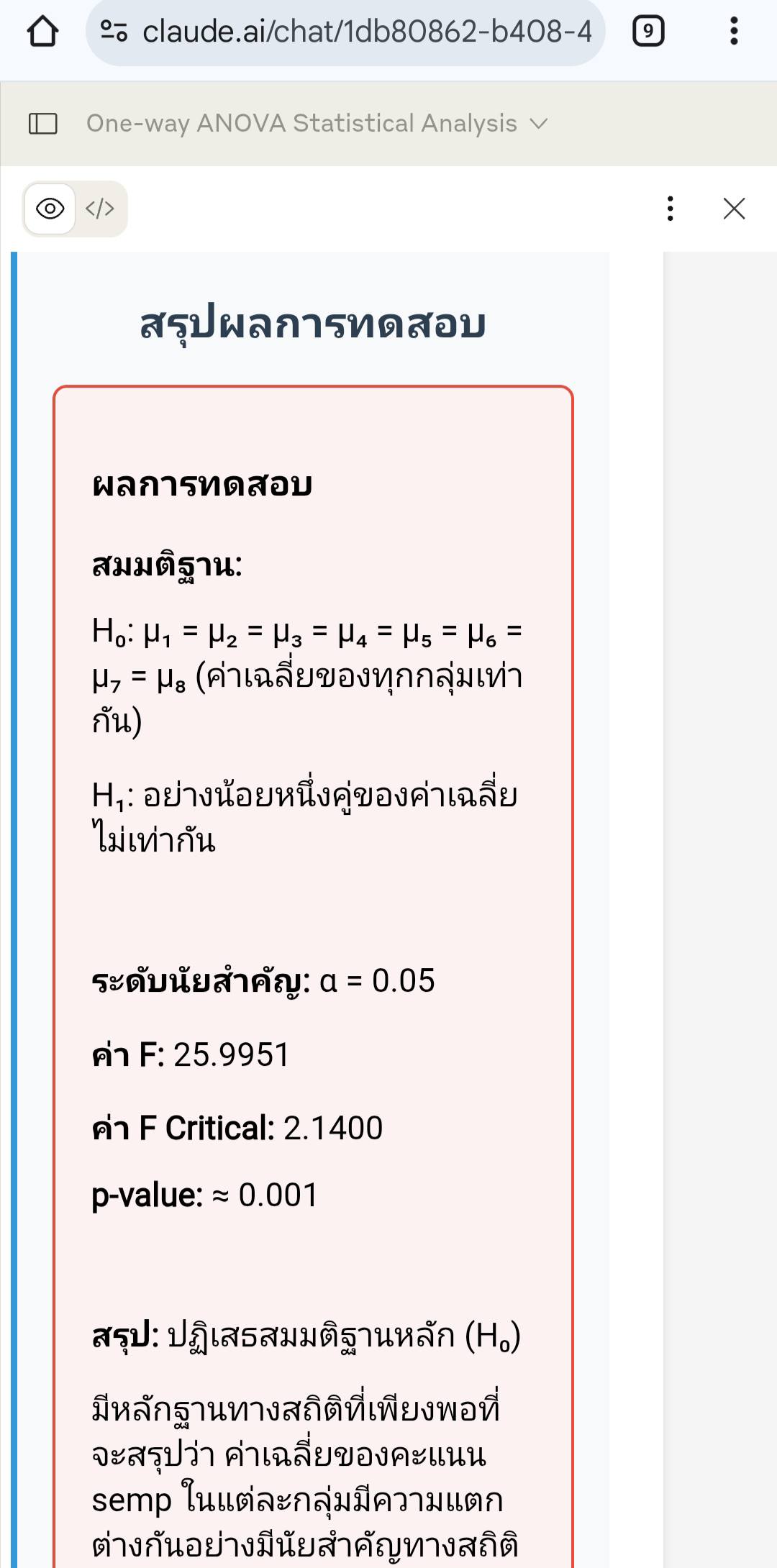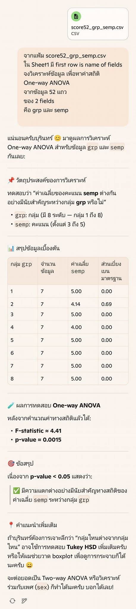 SPSS Data Editor Menu, File, Read Text Data ..., All Files (*.*) score52_grp_semp.csv Next, Delimited = checked, Variable names = checked, Next Next, Comma = checked, Next, Next, Finish Menu, File, Save as .. , score52_grp_semp.sav Menu, Analyze, Compare Means, One-Way ANOVA ..., - Dependent List = semp (ความพึงพอใจต่อเจ้าหน้าที่) - Factor = grp (เลขที่กลุ่ม) - Option, Descriptive = checked จะได้ตารางข้อมูลสรุป เช่น count, max, min OK --- Sig. = .000 F-Statistic = 25.995 --- GET DATA /TYPE=TXT /FILE='D:\thaiall.com\looker\score52_grp_semp.csv' /DELCASE=LINE /DELIMITERS="," /ARRANGEMENT=DELIMITED /FIRSTCASE=2 /IMPORTCASE=ALL /VARIABLES= sid F5.0 grp F1.0 sex A1 semp F1.0. CACHE. EXECUTE. DATASET NAME DataSet1 WINDOW=FRONT. SAVE OUTFILE='C:\score52_grp_semp.sav' /COMPRESSED.